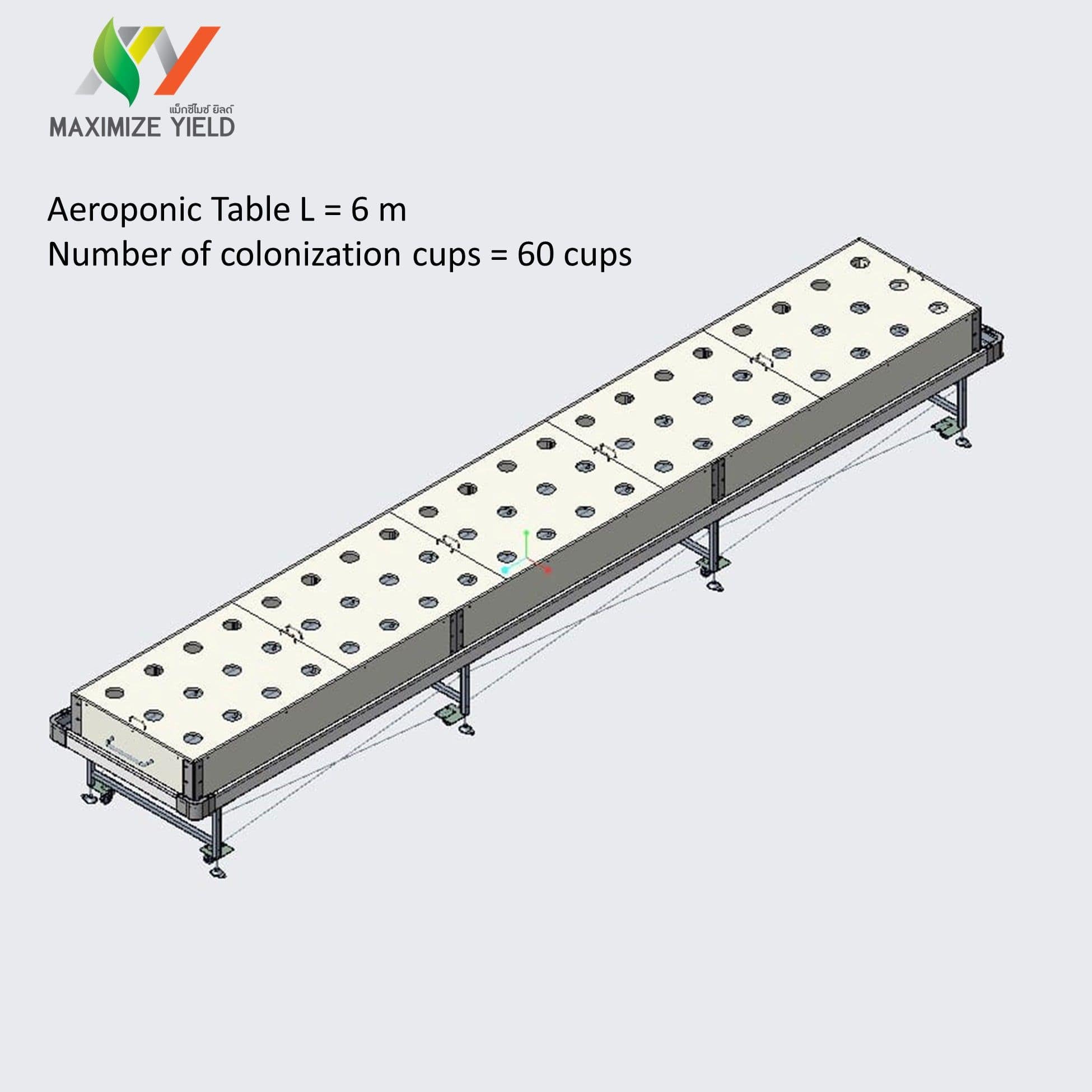 • โต๊ะปลูกพืชระบบแอโรโพนิกส์ กว้าง 1.1 เมตร ความยาว 6 เมตร ปลูกพืชได้ประมาณ 60 ถึง 120 ต้นขึ้นอยู่กันพันธุ์พืชที่ปลูก เหมาะสำหรับ ห้องปลูก (Indoor farm)